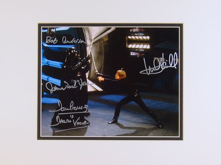 Darth Vader Autograph Photo - autographs of James Earl Jones (voice), Dave Prowse (actor) and Bob Anderson (stunt double) and Mark Hamill on a superb colour photo of Darth Vader and Luke Skywalker lightsabre fighting