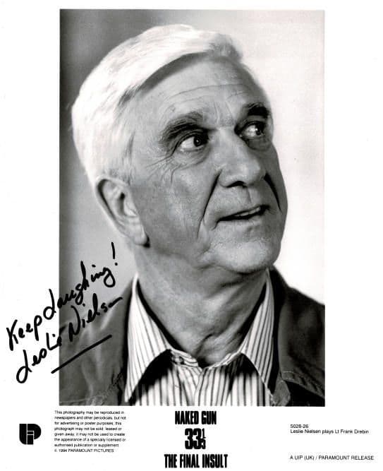 Leslie Nielsen Autograph Signed Photo - black ink autograph of comedy actor Leslie Nielsen on a promotional photo for The Naked Gun 33.3 The Final Insult
