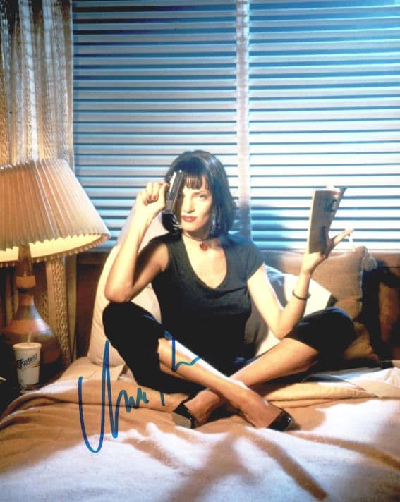 Uma Thurman Autograph Signed Photo - blue marker pen autograph of actress Uma Thurman on a stunning colour photo from Pulp Fiction